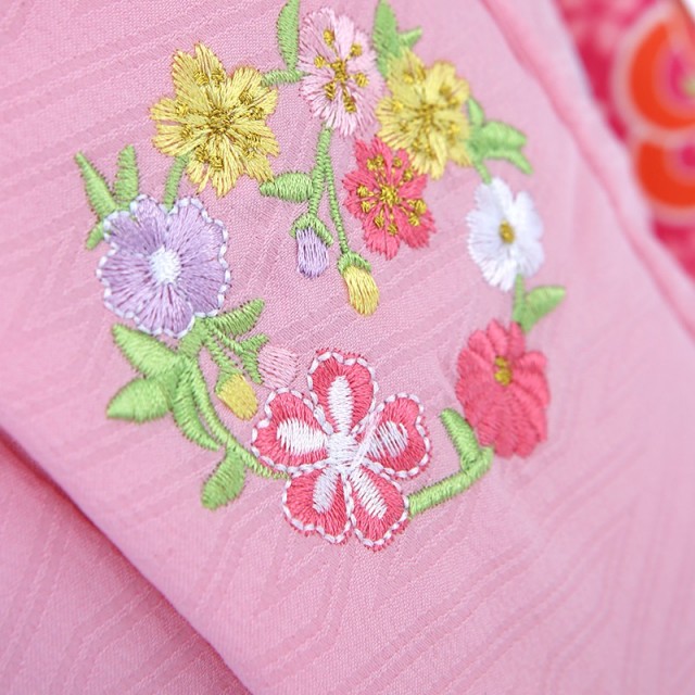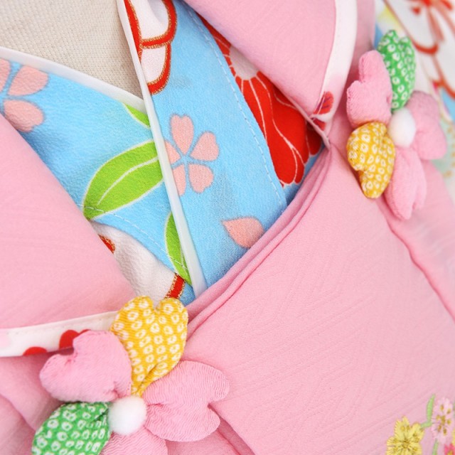 明るい青色は「空色」と呼ばれます。晴れ渡った日の大空をイメージした爽やかで明るい色味です。被布は可愛く非常に華やかな「撫子色」です。まさに撫子の花のような鮮やかなピンク色。穏やかな温かさがある色味です。どちらもおめでたい日に相応しい前向きさを感じる色彩で、日本の伝統色とされています。被布の中心に描かれる「花丸紋」は、角がなく柔らかい優しい印象を与えます。円は終わりがないということから、永遠の幸せを意味します。そして「円=縁」を連想させ、ご縁に恵まれるようにという願いが込められます。着物には華やかな花々が大きく描かれていて豪華な印象。「梅」は「ねじり梅」で描かれ、厳しい冬の後いち早く美しく香り高い花を咲かせることから、長寿の意味と、逆境でも負けずに花を咲かせてほしいという美しい力強さを指します。「桜」は咲き誇る姿から繁栄や豊かさを意味し、春に咲くことから幸先の良い「物事のはじまり」を意味します。「菊」は、放射線状に咲く姿が太陽をイメージさせ、最も位の高い花とされ、高貴な印象を与えます。また炎症を抑える作用があり、健康を願うお守りの役割があります。古くから愛される伝統的な文様と、可愛い色彩が魅力的なこちらの着物。正統派な着物ですが、可愛さや愛くるしさがあり、幼い子の晴れの日に非常におすすめです。これからの幸せを願い、素敵な一日にしてください。
