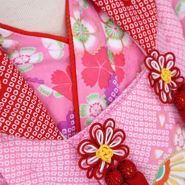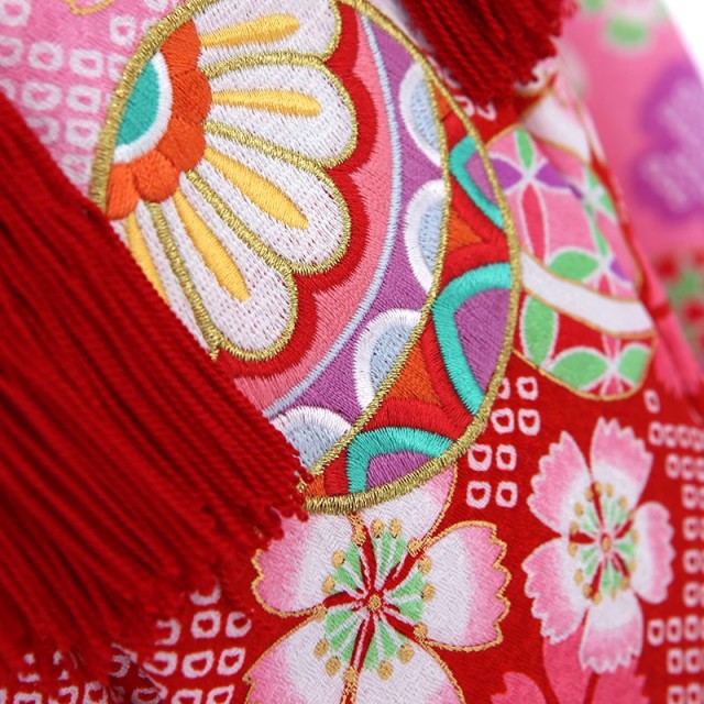 着物地の鮮やかな紫みのピンクは「牡丹色」と呼ばれ、牡丹の花びらのような色のことです。春から夏にかけて咲く花なので、明るく華やかな印象を与えます。紫が少し入ることで、上品で落ち着いたピンクに仕上がっているところも、この着物のこだわりの一つです。描かれる文様は、華やかで縁起のいい吉祥文様。可憐な花は「撫子」です。日本人女性の美称で「大和撫子」という言葉があるように、撫子は美しいものの象徴とされてきました。美しく優雅で少し控えめな花は、非常に可憐な印象を与えます。また「子を撫でる」と書きますが、撫子の花は子どもの頭を撫でたくなるような愛らしさがあるということから名付けられました。女の子の晴れ着に相応しい花でしょう。そして「手毬」は豪華で格調高い文様です。平安時代、貴族の遊び道具だったことから高貴さを表します。また丸くコロンとした形状から、何事も丸く収まりますように、丸く大きく育ちますようにと願いが込められます。そして遊び道具を描くことで、これからの人生で寂しくならないようお守りのような役割も持ちます。お花畑の中で、手毬で遊んでるようなイメージのこちらの着物。愛くるしさと可愛さが溢れる一着です。