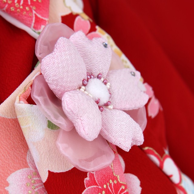 真っ赤な着物は正統派な印象を与え、格調の高さを感じます。「赤色」は邪気を払う色とされているので、大切な節目にはぴったりです。伝統的な定番色として親しまれるのは、このようなお守りの意味があり、おめでいたい色として受け継がれているのです。着物はシンプルですが、被布に華やかで豪華な吉祥文様が描かれているので、非常にバランスがよく仕上がっています。「桜楓」は、春の桜と秋の楓が描かれます。季節の違う美しいものを組み合わせて更に美しさを増すとされています。四季を大切にする日本人ならではの嗜好から生まれたものでしょう。そして「鶴」は、「鶴は千年、亀は万年」と言われるように、長寿の象徴とされます。また純白の姿と大空の美しく飛ぶ気高さから、高貴なものを表します。「折り鶴」で描くことで子どもらしい可愛らしさが出ています。また「鹿の子絞り」の繊細さが更に上品で華やかさを感じます。美しさや高貴な意味を持つ文様がよく映える、伝統的な王道着物。正式なシーンだからこそ、受け継がれる正装は非常におすすめです。まわりとは少し違った格調の高さがあります。何年経っても色褪せない美しさは大切にしていきたい伝統文化です。幼い子の大切な晴れの日に、お祝いの想いを着物に込めて、健やかな成長をお祈りください。