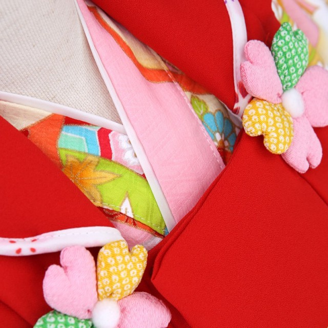ガーリーな色使いが非常に可愛らしく華やかに仕上がっています。被布は鮮やかな「赤色」、赤には厄除けの意味がありお守りのような色味です。そして中央に「花丸紋」が描かれています。丸紋は始まりも終わりもないことから永遠の意味が込められます。そして「円=縁」を連想され、ご縁に恵まれるようにという願いがこもった縁起のいい文様です。一緒に花々が描くことで、可憐な印象を与えます。着物は「撫子色(なでしこいろ)」という撫子の花のようなピンク色で全体が染められます。撫子は「大和撫子」という言葉があるように、日本女性の美しさを表現する花です。上品で少し控えめな可愛さを感じます。そして描く文様は美しく彩り豊か。厳しい冬のあといち早く花を咲かせる「梅」、雪に負けず真っすぐに伸びる「竹」は、長寿の象徴とし、逆境にも負けない力強さを意味します。「菊」は放射線を描く花のかたちが太陽を連想させ、最も位の高い花とされ、高貴さを表します。「亀甲花菱」は、亀甲は亀の甲羅をモチーフにした六角形の文様のことで長寿を表し、中に菱型の花が描かれます。女の子らしい可愛い雰囲気ですが、慶事を象徴する伝統的な文様ばかり。この着物のように色鮮やかな人生になりますように、そんな願いを込めた一着です。