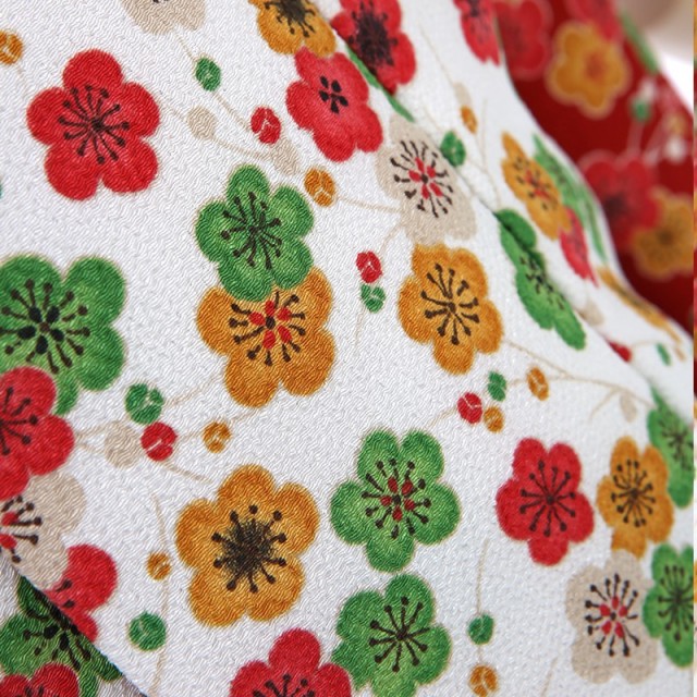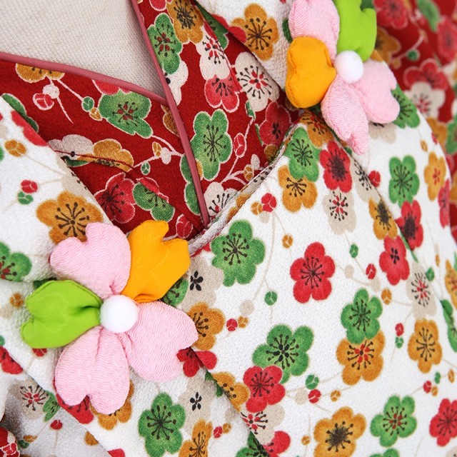 被布と着物に美しい「梅」が繊細に描かれた、古典的で華やかな一着です。梅は「百の花に先駆けて咲く」と言われ、冬が過ぎ去った後にいち早く美しく香り高い花を咲かせます。厳しい冬に負けないことから長寿を表し、辛く厳しいことが起きても乗り越えて花を咲かせてほしいという、逆境に負けない力強さを意味する文様です。そして春の訪れは誰もが待ち遠しい気持ちになります。春の訪れや、始まりを知らせる花は非常に縁起がいいとされ、古くから愛されてきました。また梅の「毎」は、母親を意味し、女性らしさも感じます。着物と被布の紅白の色が更におめでたさを増しています。古典的な吉祥文様ですが、あまり人と被らないデザインでオリジナルさが魅力です。古くから愛される梅の花のように皆から愛される子になってほしいと、こちらの着物にはそんな願いが込められています。