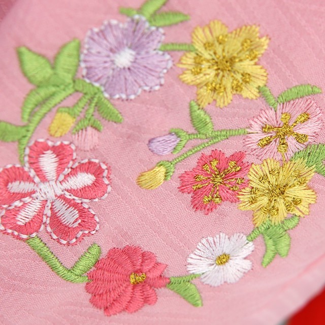 鮮やかな「赤色」は、古くから親しまれる正式な色です。やはり定番色は格調の高さを感じます。そして被布のピンク色は「撫子色」と呼ばれ、撫子の花のような可憐な印象を与える色味。「大和撫子」という言葉があるように美しい女性のような華やかさがあります。被布と着物には「花丸紋」が描かれます。丸紋は始まりと終わりがないことから永遠を意味します。「円=縁」を連想して、いいご縁に恵まれるようにとされています。丸紋と一緒に縁起のいい花や物が描かれていて、「梅」は厳しい冬のあといち早く花を咲かせる、「松」は冬も美しい緑を絶やさないことから、辛いことが起きても乗り越える力強さを意味します。「菊」は放射線状に広がって咲く形状から太陽をイメージし、最も位の高い花とされています。皇室の家紋も菊紋なので高貴さを感じます。「守り紋」は災いを避けるお守りのような役割をし、「打ち出の小槌」は、一生において物やお金に困らないようにという意味が込められています。幸せの印とされる吉祥文様が多く描かれ、日本の文化を感じる古典着物です。これから生きていく上で、大切な意味が込められていて、なかなか普段伝えられない想いを着物に託すことが出来る、そんな一着に仕上げました。