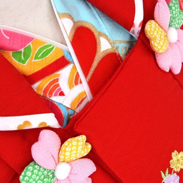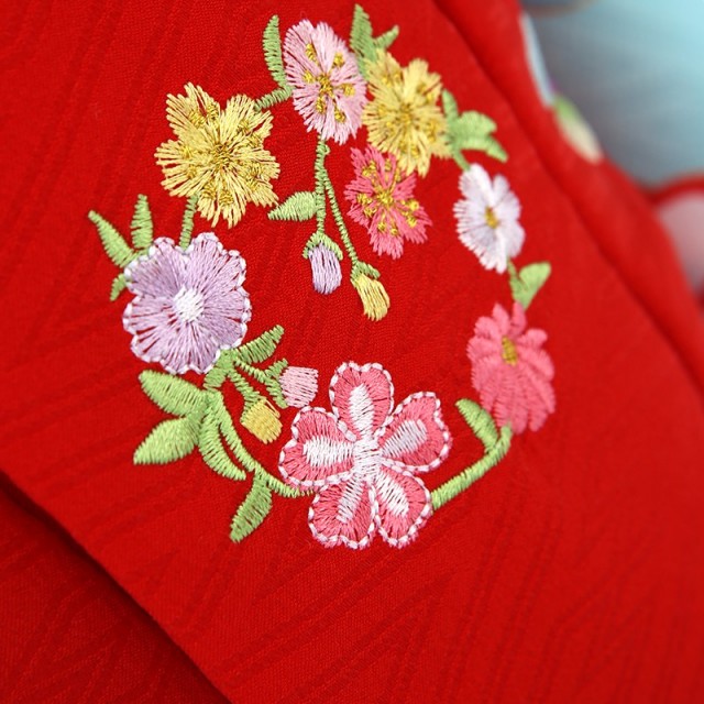 厄除けの意味がある鮮やかな「赤色」に、中心に「花丸紋」が描かれます。花々が一緒に描かれ、丸い紋様なので女性らしく優しい印象を与えます。被布はシンプルで控えめな可愛さですが、着物が非常に艶やかなので、まとまりがよく仕上がっています。晴れた日のような鮮やかな「空色」は爽やかな明るいブルー。色彩豊かに描かれる文様は、縁起のいい吉祥文様ばかり。「梅」は厳しい冬の後いち早く美しく香り高い花を咲かせます。辛いことにも負けない力強い美しさを意味します。「菊」は放射線状に咲くことから太陽を連想させ、最も位の高い花とされ高貴さを表します。また炎症を抑える作用があるとされ、健康を願う文様とされています。そして「亀甲花菱」は長寿の意味を持つ亀モチーフの亀甲に花菱が描かれ、「紗綾形文様」は不断長久を意味し、繁栄や長寿の願いが込めれました。「青海波文様」は、無限に続く穏やかな波に平和の願いが込められています。華やかで縁起のいい文様が盛り沢山で、色彩の豊かさが美しく、お祝いの日に相応しい装いをしていただけるでしょう。