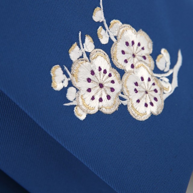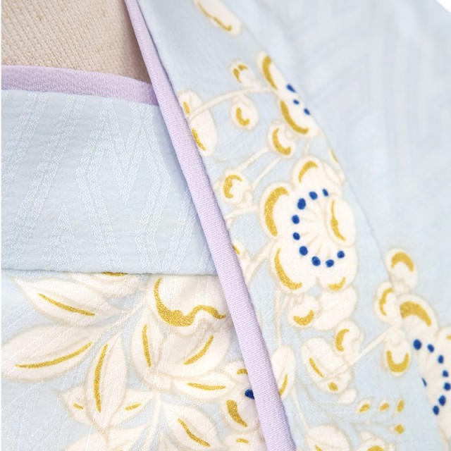 着物の淡く優しい青は「白藍(しらあい)」と呼ばれ、藍染の中で最も薄く、淡い水色のことを指します。そして袴は「青藍(せいらん)」と呼ばれる紫を含んだ濃く深い青色です。同じ藍色でも明度や彩度が違いますが、組み合わせると統一感を感じるのは同じ藍色だからでしょう。繊細な違いを表現する日本ならではの色彩が美しさを感じます。描かれる文様は可憐で美しい花々。「梅」は厳しい冬が終わりいち早く花を咲かせることから、逆境にも負けない強さ、美しさを表します。「牡丹」は大輪の花を咲かせるので高貴さや美しさを表します。「藤」は沢山花をつけることから豊作や繁栄を表します。すべて縁起のいい吉祥文様ですが、描き方が非常に上品で控えめ。大人の着物のような格調の高さを感じます。大人っぽい装いで、凛とした印象を与える着物に仕上がりました。他とは違う品の良さは、何年経っても色褪せない魅力があります。一生に一度の晴れの日は、普段着ではなかなか無い上品な色味のものを着て、これからの幸福と健やかな成長をお祝いください。