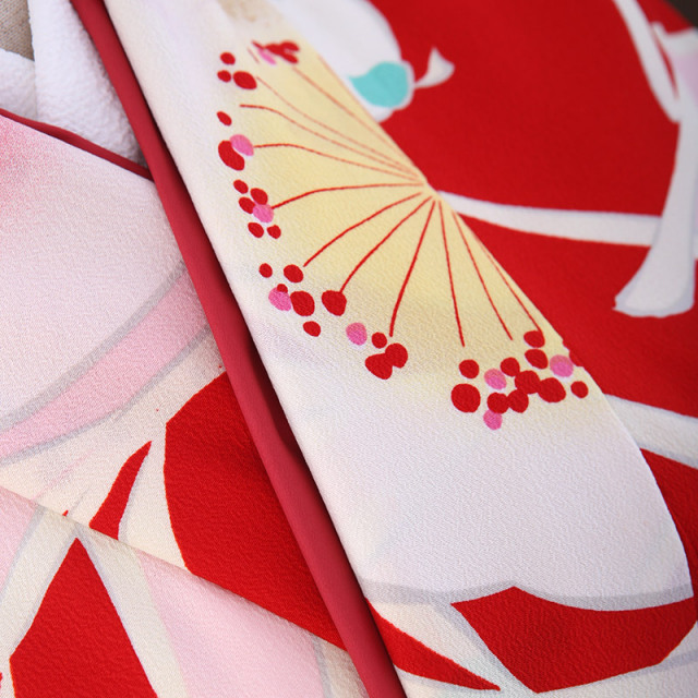 着物の地色の「赤色」は、アクティブでエネルギーを感じる色。「家族の繋がり」や「絆」を意味しています。見る人や着る人も温かさを感じ前向きな気持ちになるとされている色なのです。