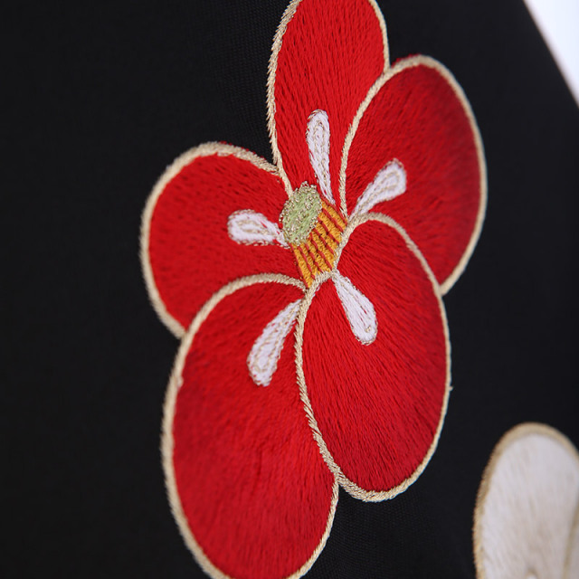 そして題材となっている「梅の花」は、奈良時代に中国から輸入されたもので寒さ厳しき冬に香り高く咲き、「学問に励むと梅が咲く」と言われ貴族に大変好まれました。その当時の花見と言えば桜ではなく梅の花の事だったようです。女性の品格や強さを表す梅の花は万葉集にも数多く詠われ古くから日本の人々に愛されてきた花、そんなステキな絵柄の卒業袴は個性的な装いを華やかにしてくれることでしょう。