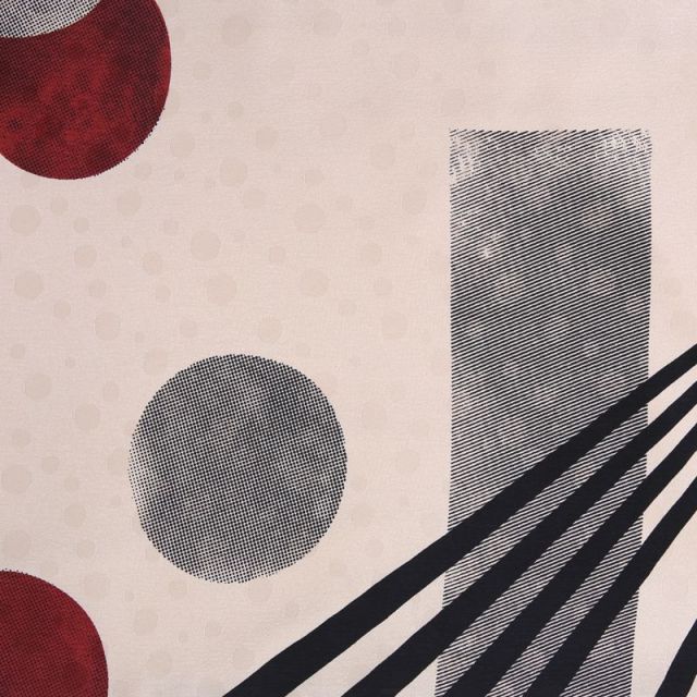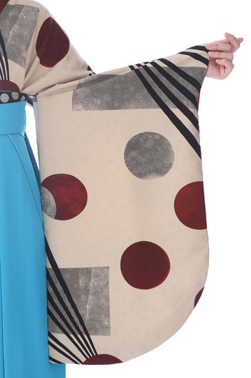 シックな地色のお着物には円形や四角、直線が描かれていますが、よく見ると小さなドットやストライプで描かれているものがたくさんあるんです。場所によっては色がかすれて、まるでレトロな印刷物のよう。