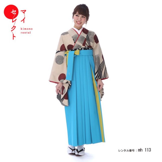 シックな色味のお着物に幾何学模様や水玉を取り入れ、更にビビッドな水色×黄色の袴を合わせるという個性派のコーディネートが活発な女性を感じさせます。