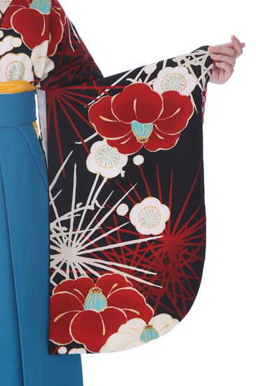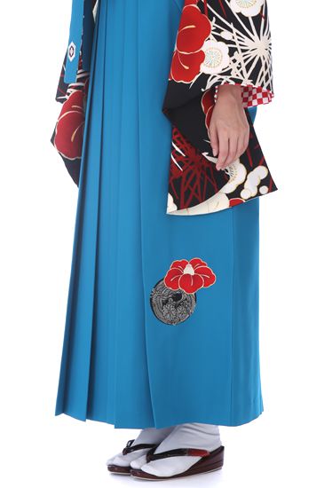 袴にも椿がポイントに入っています。ターコイズブルーの色もさえていて、ハレの日の気持ちを盛り上げてくれます。