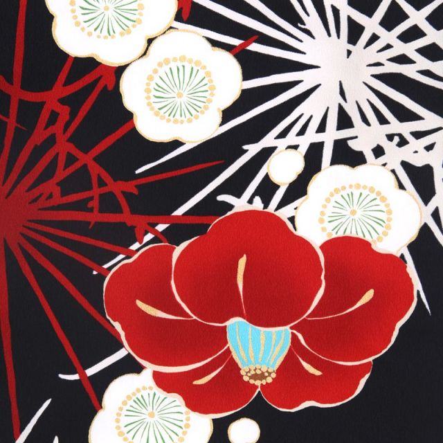 着物の柄は、赤と白の「椿」と、白い「梅」の文様。背景には、松葉を放射線状に広げた様子が、大胆でリズム良くしてくれています。