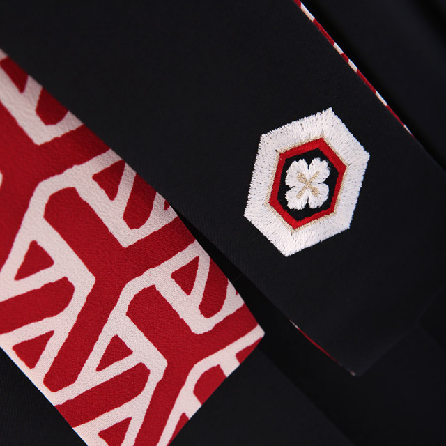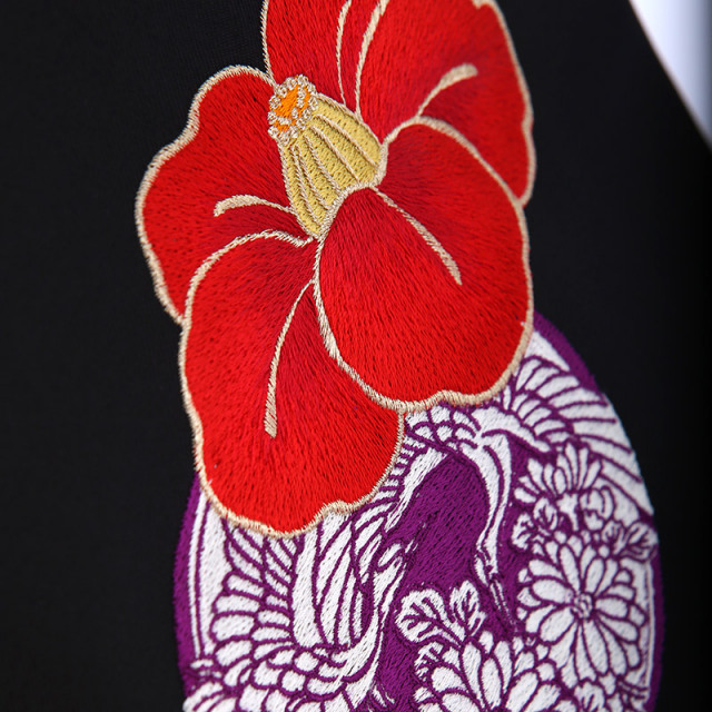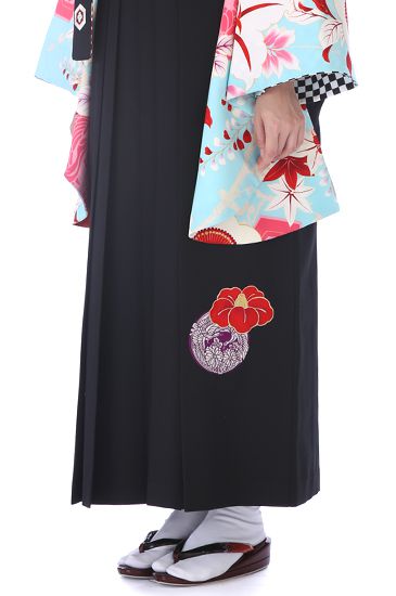 黒地の袴には、椿と向かい合った鶴の紋が、刺しゅうされて入っています。ブーツでも、かわいく着こなせる着物ですので、お履物に合わせて袴丈をセレクトしてください。