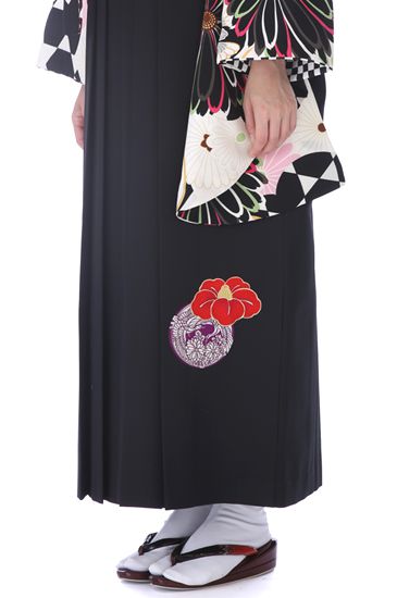 黒の袴には、2羽の鶴が丸くなっている様子の文様と、真っ赤な椿もアクセントに。