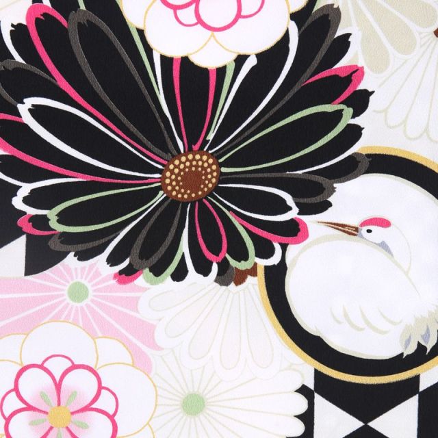 白地に菊と梅の花が、ぽってりと丸みをおびて、レトロかわいい雰囲気に。それでいて現代的に、大胆に重なり合い、アレンジされている着物です。そのなかでも黒い菊は、花びらがカラフルに縁どられていて、スタイリッシュなインパクトを放ちます。