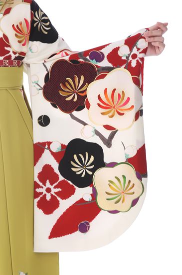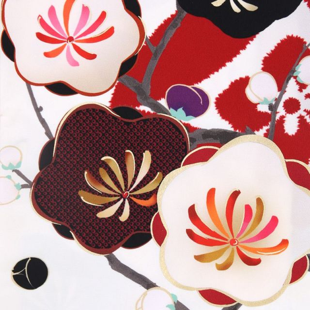 描かれている梅は、丸くふんわりとした形がかわいく印象的。これは、「光琳梅(こうりんうめ)」とよばれ、だいたんなデフォルメが人気の文様です。それでいて、すこし渋めの配色。落ち着きが出て大人っぽくも。