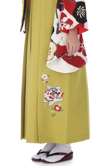 明るいからし色の袴にも、かわいらしさを底上げするワンポイントの椿の文様が。刺しゅうもほどこされ、豪華なムードです。