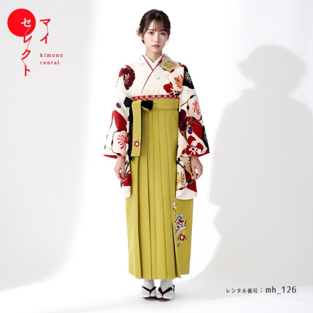 | 付属品 | 着物・袴・長襦袢(半衿付き)・半幅帯・伊達衿・巾着・草履・足袋(プレゼント)・肌襦袢(ワンピースタイプ)・腰紐4本・コーリンベルト・前板・伊達締め2本・衿芯 ※ブーツは付属されませんが、当店の有料オプションからレンタル可能です。 ※ブーツをご利用される場合、草履・足袋は付属されません。 |