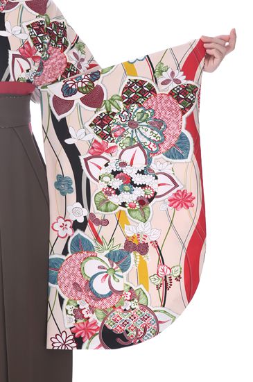 橘とともに描かれている梅の花、そのフォルムも人気ですし意味も「忍耐力」や「美」を意味し「力強い美しい女性」の比喩としても使用されています。華やかな小振袖に落ち着いた袴を合わせることで、ステキな文様の絵柄が引き立つようにコーデされ可愛らしい装いになっています。