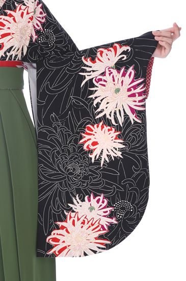 黒の地色に大胆な絵模様の菊が印象的な小振袖と袴のセット、大人の雰囲気を持つ神秘的な印象を感じさせます。黒は重厚で高級感を感じさせる色です。周囲の色を引き立たせ際立たせる効果もあります。その効果があり絵模様に使用されている大胆な菊の絵柄が引き立っていますね。