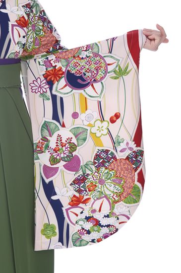 白地に古典柄の花模様が華やかな小振袖、さわやかな袴とのコントラストが優しい雰囲気を織りなしています。