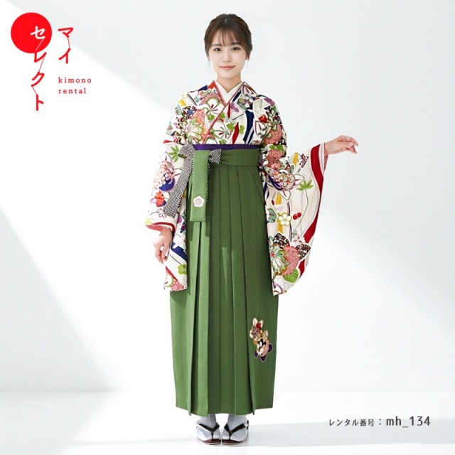 | 付属品 | 着物・袴・長襦袢(半衿付き)・半幅帯・伊達衿・巾着・草履・足袋(プレゼント)・肌襦袢(ワンピースタイプ)・腰紐4本・コーリンベルト・前板・伊達締め2本・衿芯 ※ブーツは付属されませんが、当店の有料オプションからレンタル可能です。 ※ブーツをご利用される場合、草履・足袋は付属されません。 |