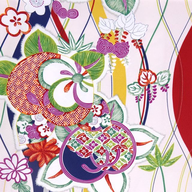 小振袖に描かれているハート型の絵柄は橘(たちばな)文様と言い、ミカン類の一種です。果実と葉っぱを一緒に文様化したものは珍しい絵柄で、格調の高い文様とされています。葉の部分が四季を通して緑を保つことから「永遠」や「不老不死」の意味を持っています。実の部分は霊薬として使用されたりしていたそうです。