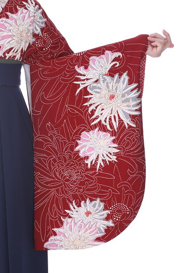 また菊の色や大きさなどによって意味が様々あります。赤の菊は「社会への愛」、大菊は「あなたを心から愛します」、白菊は「真実を求める」などです。そして花柄の中でも最も位の高い花とされ「高貴」や「高潔」「高尚」などの意味も持つとされています。紺色の袴ととっても相性良く小振袖が生きてくるコーデです。