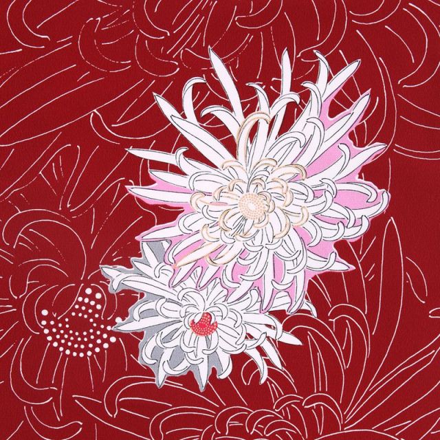 エンジ色に描かれている豪華な菊の花は、平安時代中国より伝来し、宮中で菊の節句と呼ばれる「重陽の節句」(旧暦9月9日)が明治時代まで行われ、現在は皇室園遊会(観菊御宴)として毎年行われて大変身近な花となっています。また鎌倉時代の後鳥羽上皇がとても愛でており身の回りの品々にその絵模様を施した事から天皇および皇室の菊花紋章(十六弁八重表菊紋)としても有名ですね。