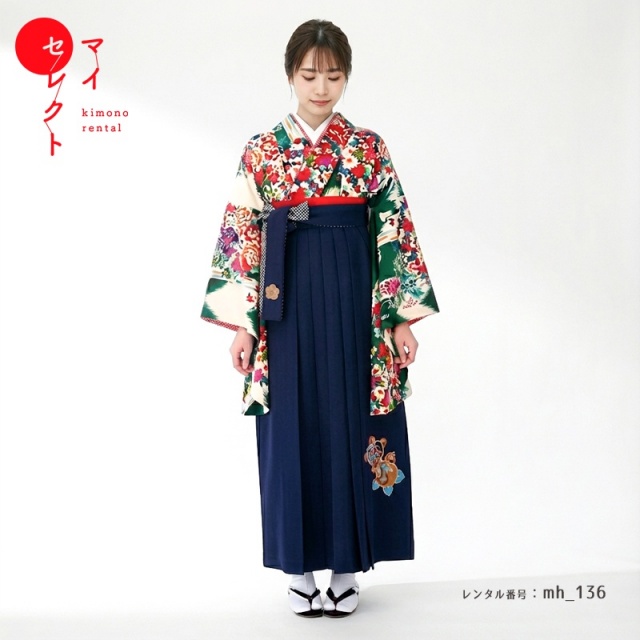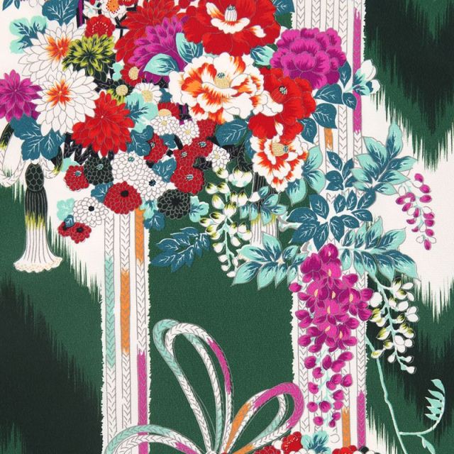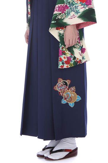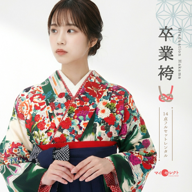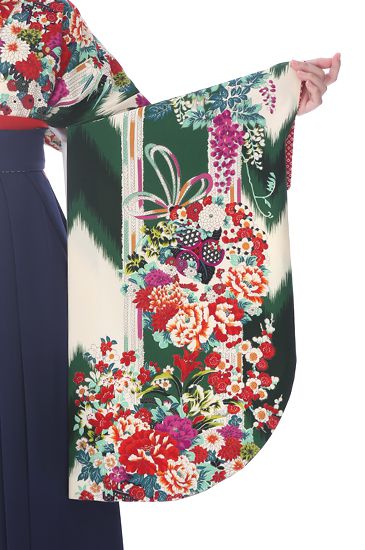 緑の矢絣の地模様に色とりどりの花々が美しい卒業袴、細やかな意匠が繊細さをしとやかにしています。