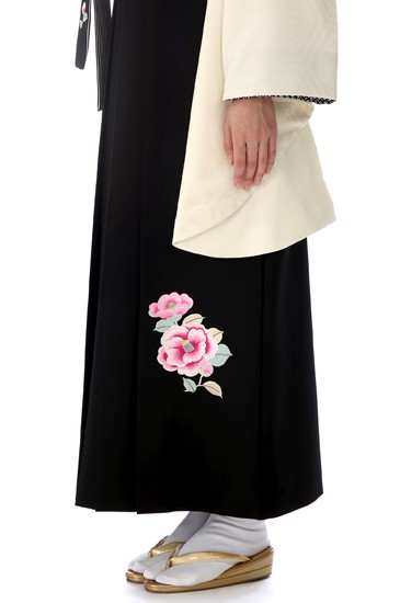黒1色の袴には、「椿」のワンポイントが施されています。茶人にも愛された「椿」は女性の着物のモチーフとしても大人気。