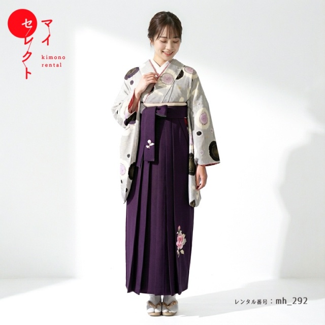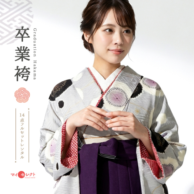 | 付属品 | 着物・袴・長襦袢(半衿付き)・半幅帯・伊達衿・巾着・草履・足袋(プレゼント)・肌襦袢(ワンピースタイプ)・腰紐4本・コーリンベルト・前板・伊達締め2本・衿芯 ※ブーツは付属されませんが、当店の有料オプションからレンタル可能です。 ※ブーツをご利用される場合、草履・足袋は付属されません。 |