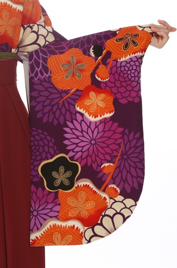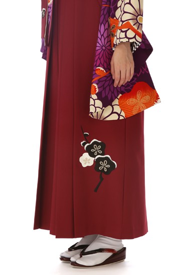 臙脂色の袴は、紫色の着物とのコーディネートも抜群。