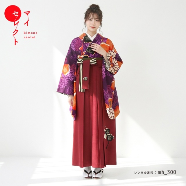 | 付属品 | 着物・袴・長襦袢(半衿付き)・半幅帯・伊達衿・巾着・草履・足袋(プレゼント)・肌襦袢(ワンピースタイプ)・腰紐4本・コーリンベルト・前板・伊達締め2本・衿芯 ※ブーツは付属されませんが、当店の有料オプションからレンタル可能です。 ※ブーツをご利用される場合、草履・足袋は付属されません。 |