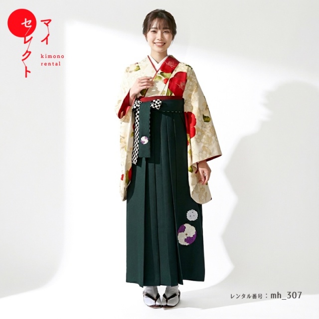| 付属品 | 着物・袴・長襦袢(半衿付き)・半幅帯・伊達衿・巾着・草履・足袋(プレゼント)・肌襦袢(ワンピースタイプ)・腰紐4本・コーリンベルト・前板・伊達締め2本・衿芯 ※ブーツは付属されませんが、当店の有料オプションからレンタル可能です。 ※ブーツをご利用される場合、草履・足袋は付属されません。 |