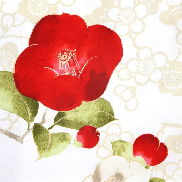 赤色で大きく描かれる「椿」とシルエットのように地色に近い色で描かれる「梅」。