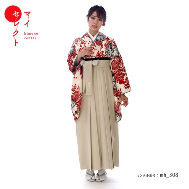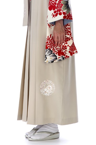 ベージュ色の袴は落ち着いた雰囲気をプラスし、着物の華やかさを引き立てています。