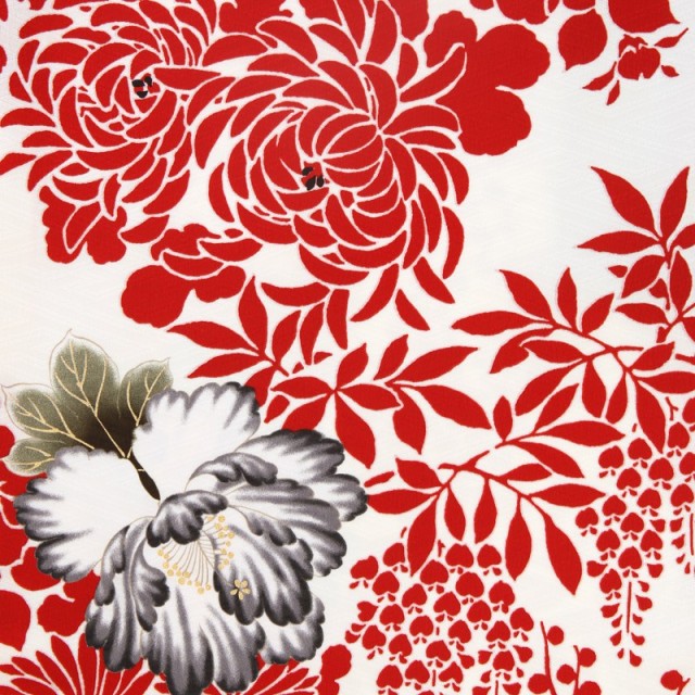 オフホワイトの着物地に映える赤で描かれた花のシルエットは様々な花を表しています。