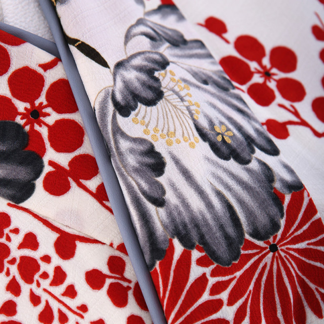 オフホワイトの着物地に映える赤で描かれた花のシルエットは様々な花を表しています。