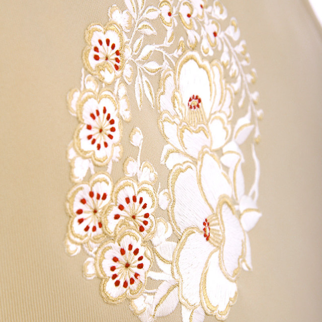 筆で書いたようなナチュラルな黒い「牡丹」は、気品溢れる女性を表す文様です。