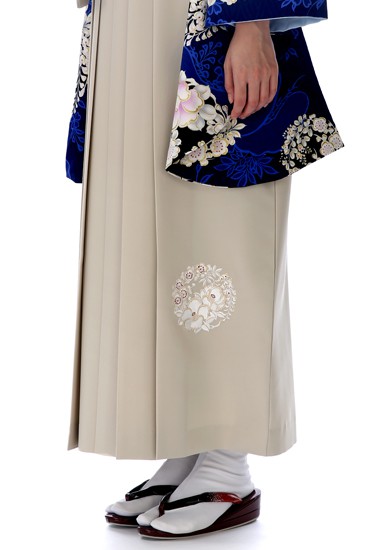 裾近には白い「花輪」、袴紐には小さな「梅」が描かれ、おとなしい色味の袴に華を添えるワンポイントになっています。