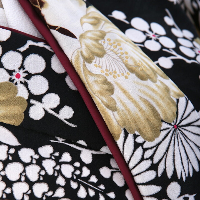 全体はシックで着物らしい仕上がりですが、そこに描かれた水彩画で描いたような優しいタッチの「牡丹」が大人っぽく個性的な雰囲気をプラスしています。