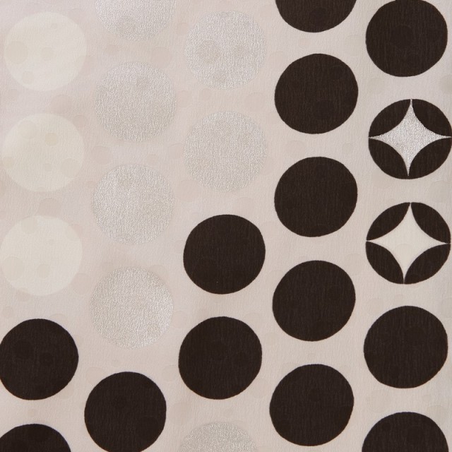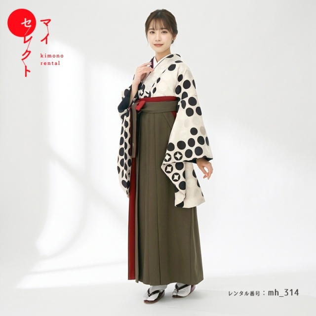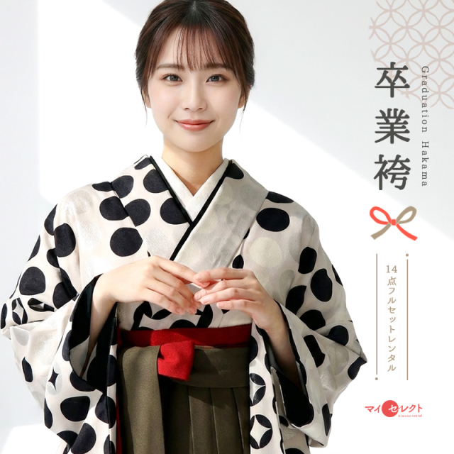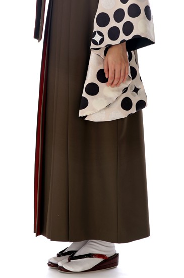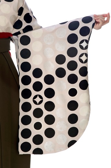 レトロ着物の復刻や、現代でも受け入れやすい魅力的なデザインを取り入れるなどして、ファッションとして着物を楽しめるようにデザインしてきたモダンアンテナが贈るシックなドット風の袴です。着物は白、黒、シルバーを中心としたモノクロ風のデザイン。ランダムにドットが配置されていますが、よく見るとキラッと光るようにドットの中に四角形がデザインされています。これは伝統文様の「七宝」を現代風にデザインしたもの。「七宝」は一つの円に同じサイズの円を4分の1ずつ重ねるとできる連続文様で、途切れることなく続くことから永遠を意味しています。シンプルなデザインの茶色の袴には、赤がアクセントとして入れられているところが魅力的です。赤は袴紐の裏面と袴のひだの内側に使われています。袴紐は結ぶと赤を少しだけ出すことができ、袴のひだは歩いて揺れるたびにちらっと赤を見せることができるので、隠れたおしゃれのポイントとなっています。シンプルな色使いとデザインながら、伝統的な文様の意味合いとファッションの感覚という2つの魅力を同時に表現した1着です。