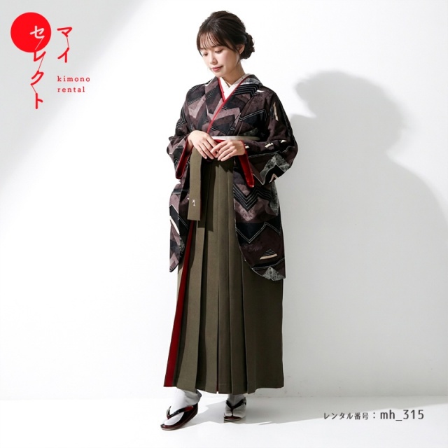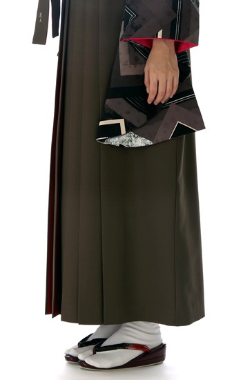 茶色の袴は着物と同系色で、文様は描かれていませんが、赤の使い方が効果的。