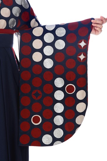 着物に描かれる無数のドットには赤、白、シルバーが使われ、華やかな印象を与えます。