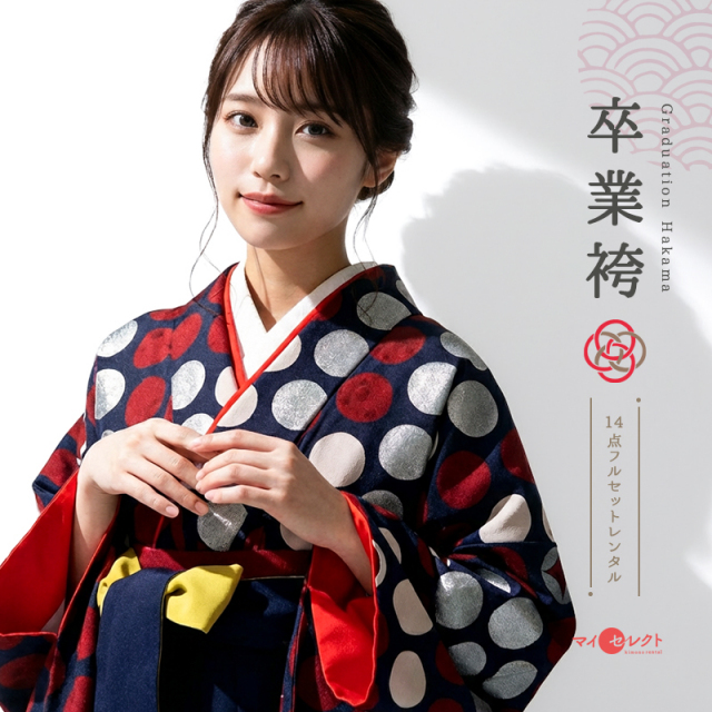| 付属品 | 着物・袴・長襦袢(半衿付き)・半幅帯・伊達衿・巾着・草履・足袋(プレゼント)・肌襦袢(ワンピースタイプ)・腰紐4本・コーリンベルト・前板・伊達締め2本・衿芯 ※ブーツは付属されませんが、当店の有料オプションからレンタル可能です。 ※ブーツをご利用される場合、草履・足袋は付属されません。 |
