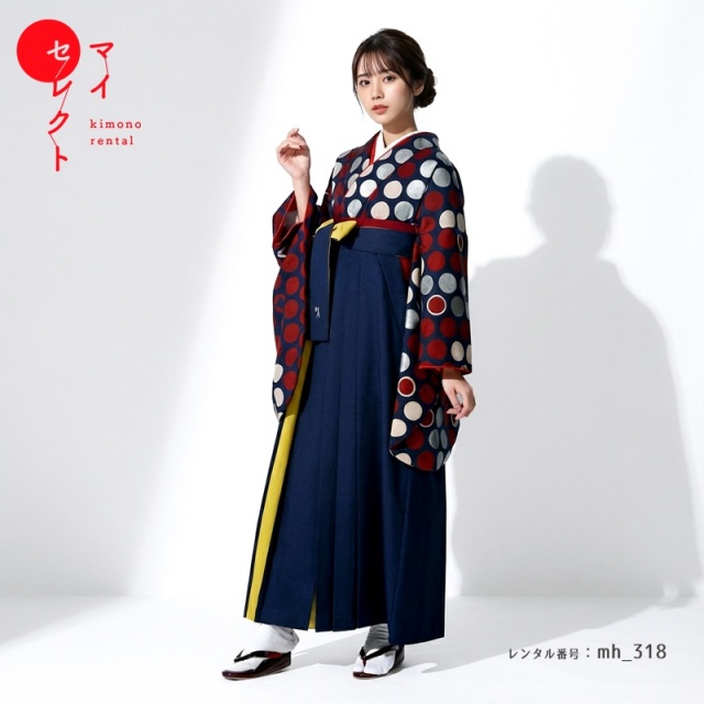 また着物の地色と同系色である紺色の袴は一見シンプルな1色のデザインですが、鮮やかな黄色がアクセントとなってコーディネート全体を華やかに仕上げます。