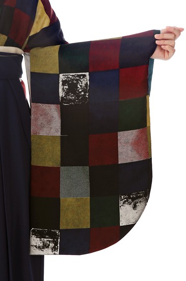 お着物は、様々な色や風合いの正方形が並び、「市松模様」を思わせます。