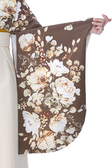 着物の茶色は「光悦茶(こうえつちゃ)」と呼ばれる、穏やかで落ち着いた雰囲気の茶色です。そこに、繊細で上品に絵画のようなタッチで美しい花々が描かれます。目が惹きつけられるのは大輪の花が美しい「牡丹」。牡丹は「百花の王」とされ、古くから幸福や富貴の象徴として描かれてきました。また不老不死、不老長寿という意味も込められています。