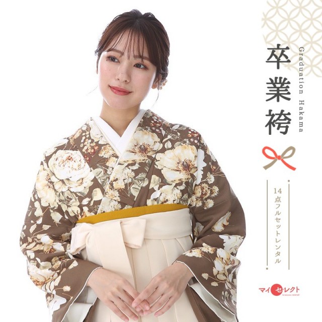 ナチュラルな「生成色(きなりいろ)」の袴を合わせることで、ふわっと女性らしい印象に。大人っぽい落ち着いた可愛らしさがこちらのコーディネートのおすすめポイントです。