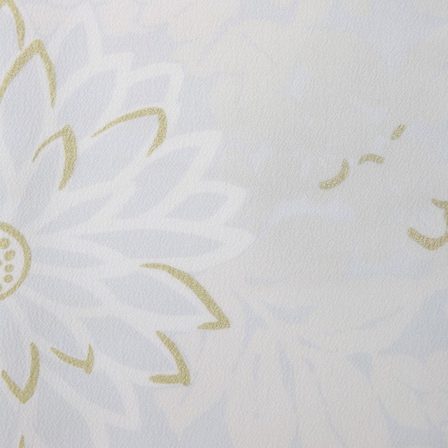 白色の着物に淡い色味で「菊」が描かれます。「菊」は、まるで太陽のように咲くことから、最も位の高い花とされ、こちらの文様は高貴さを表します。