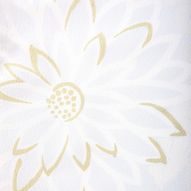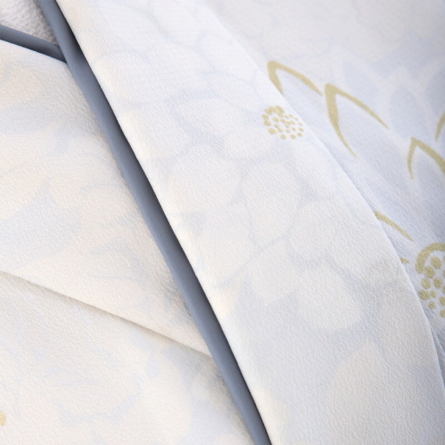 白色の着物に淡い色味で「菊」が描かれます。「菊」は、まるで太陽のように咲くことから、最も位の高い花とされ、こちらの文様は高貴さを表します。